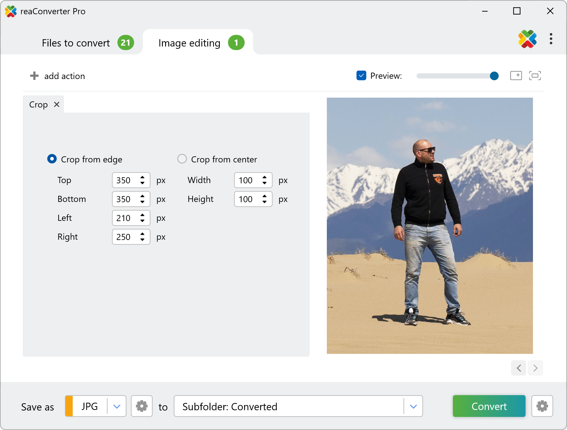Then enter the details of the cropping process. You have the possibility to crop from the center of the image, or from its edge, by entering the desired parameters. If you are unsure about what to enter here, you can always check the results in real time by ticking the Preview button.