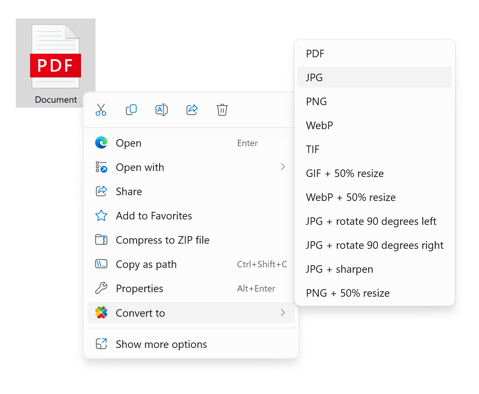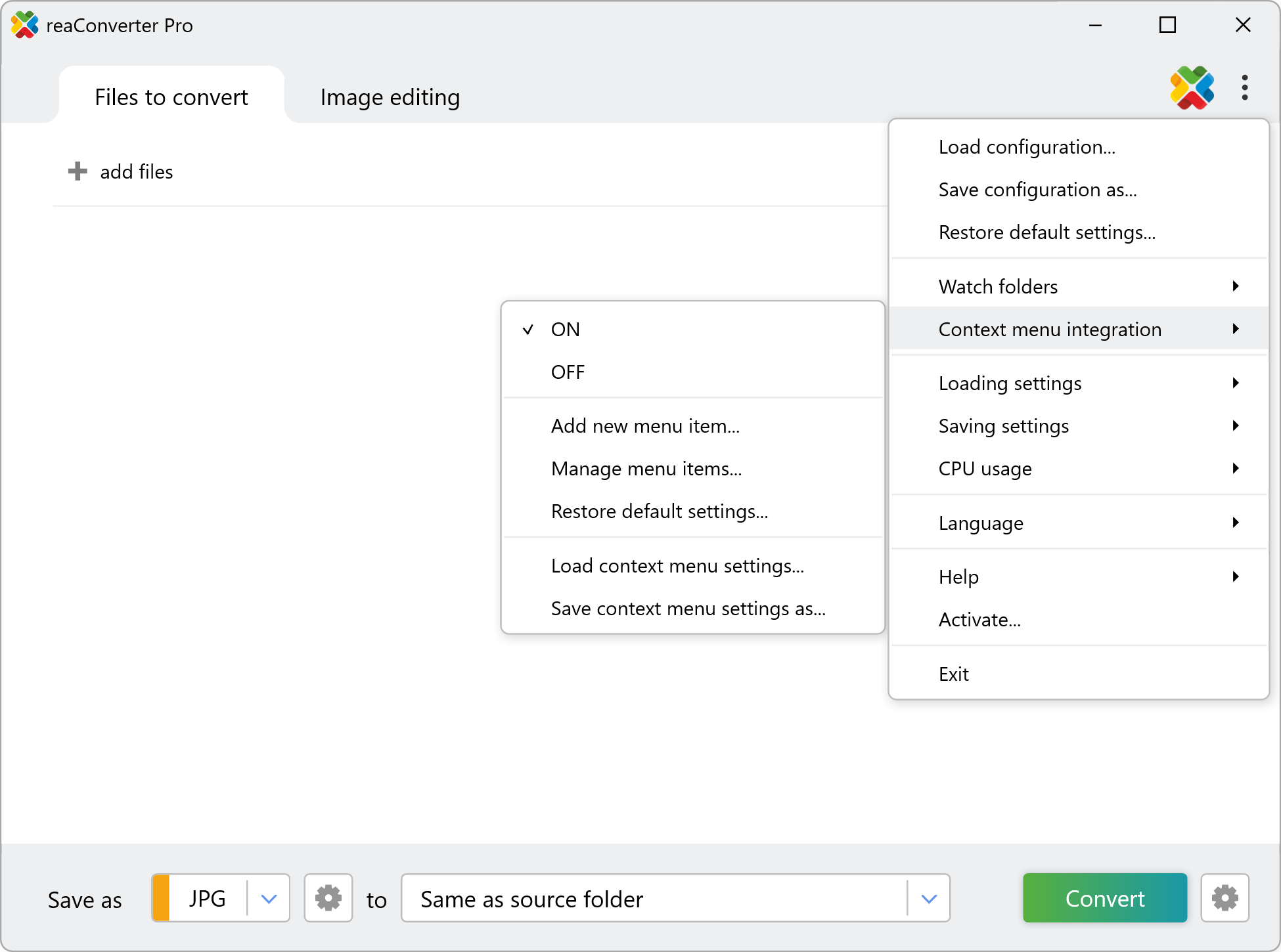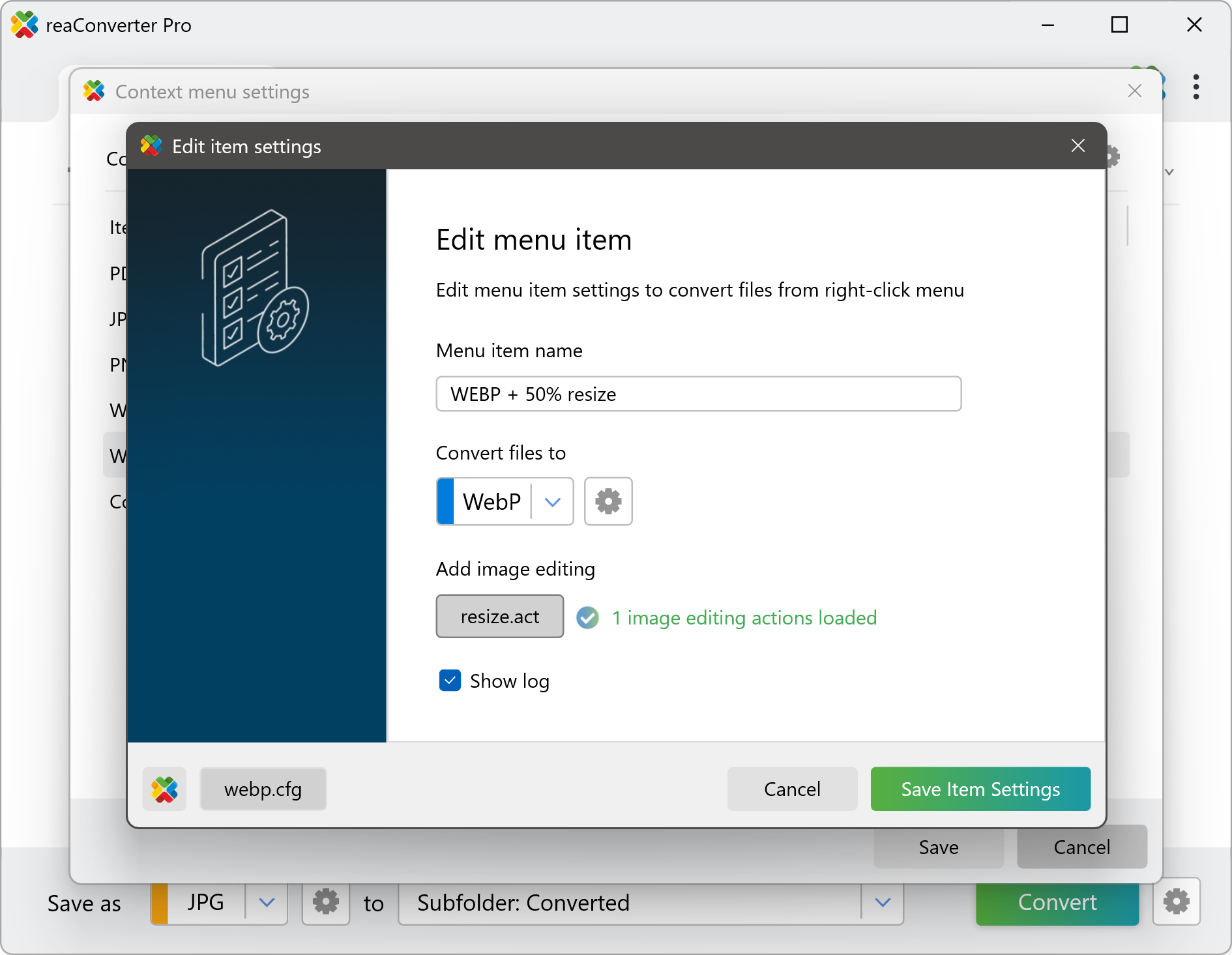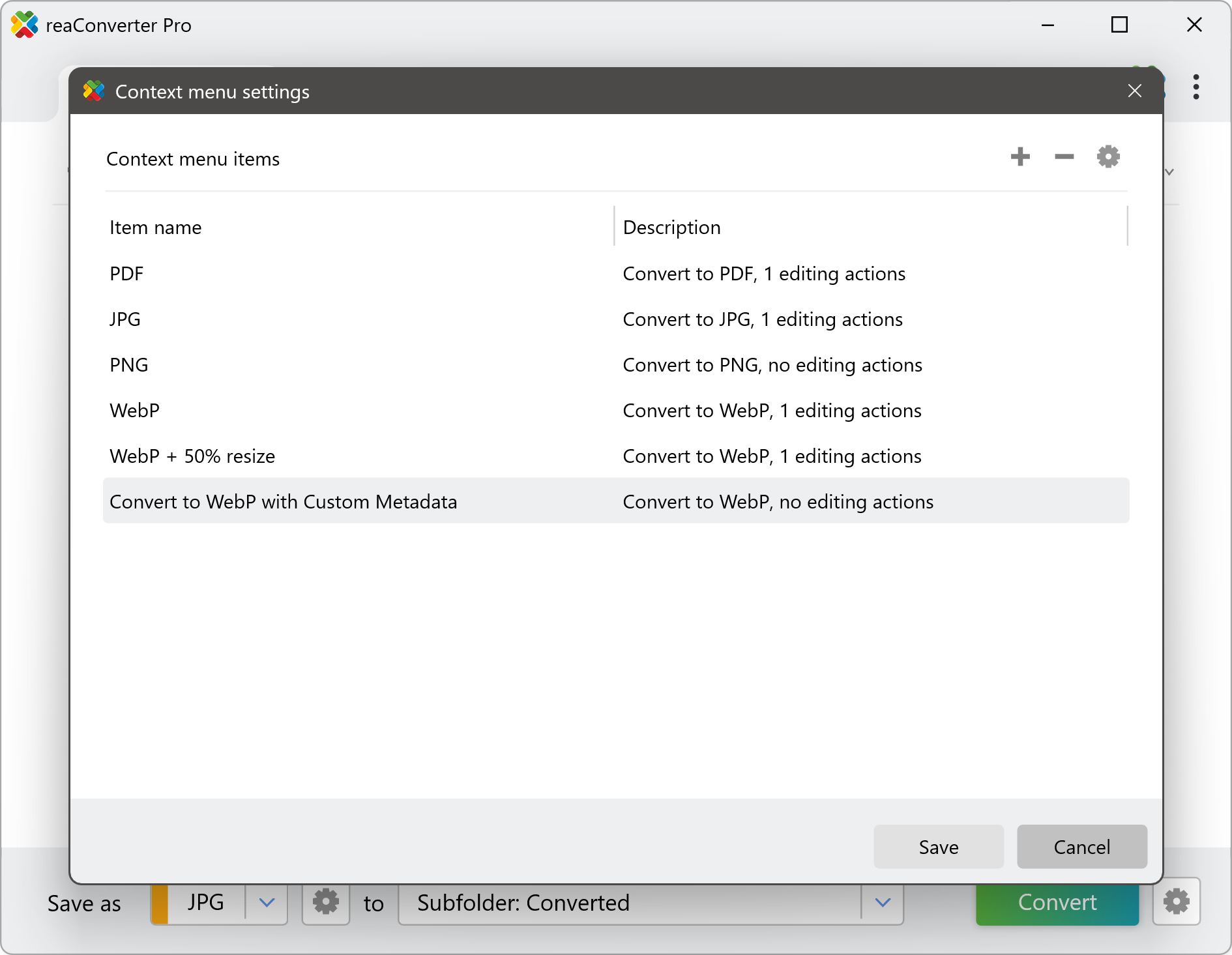 You can customize these context menu items anytime in reaConverter’s Context Menu Integration settings. There, you can add or remove specific conversion - related operations by linking reaConverter configuration (.cfg) and action (.act) files. Learn more about config and action files here.
