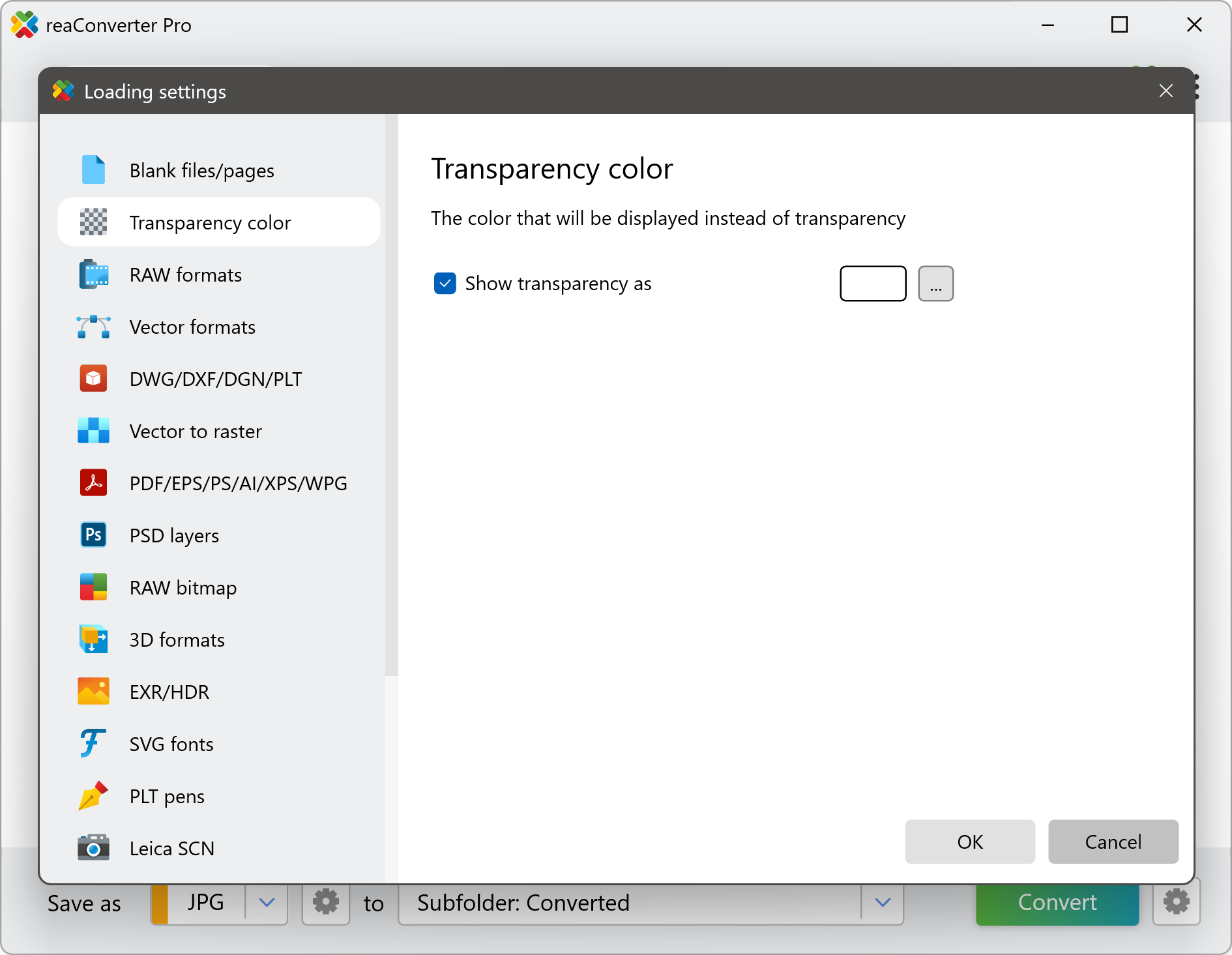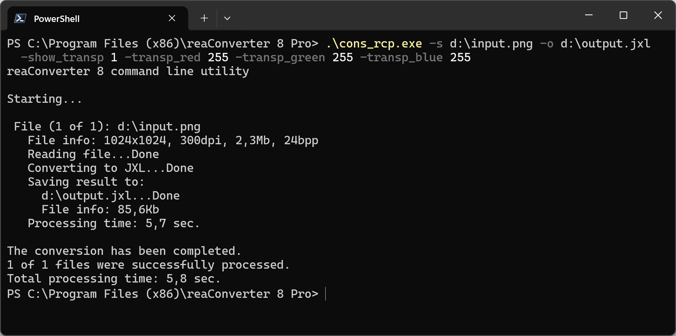You can also set transparency color using command-line interface, either manually or through automated scripts. reaConverter Pro includes a command-line tool called cons_rcp.exe — an advanced feature designed for professional use, available exclusively in the Pro edition.